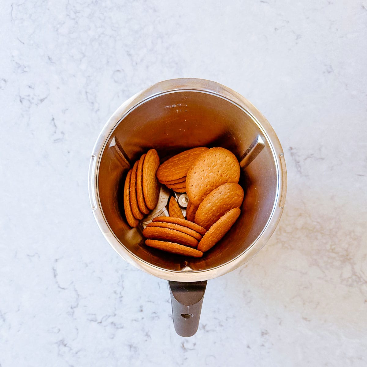 - Place the biscuits in the Thermomix bowl and crush for 3 sec/speed 6. Transfer to a separate bowl. Don't worry about cleaning the Thermomix bowl.